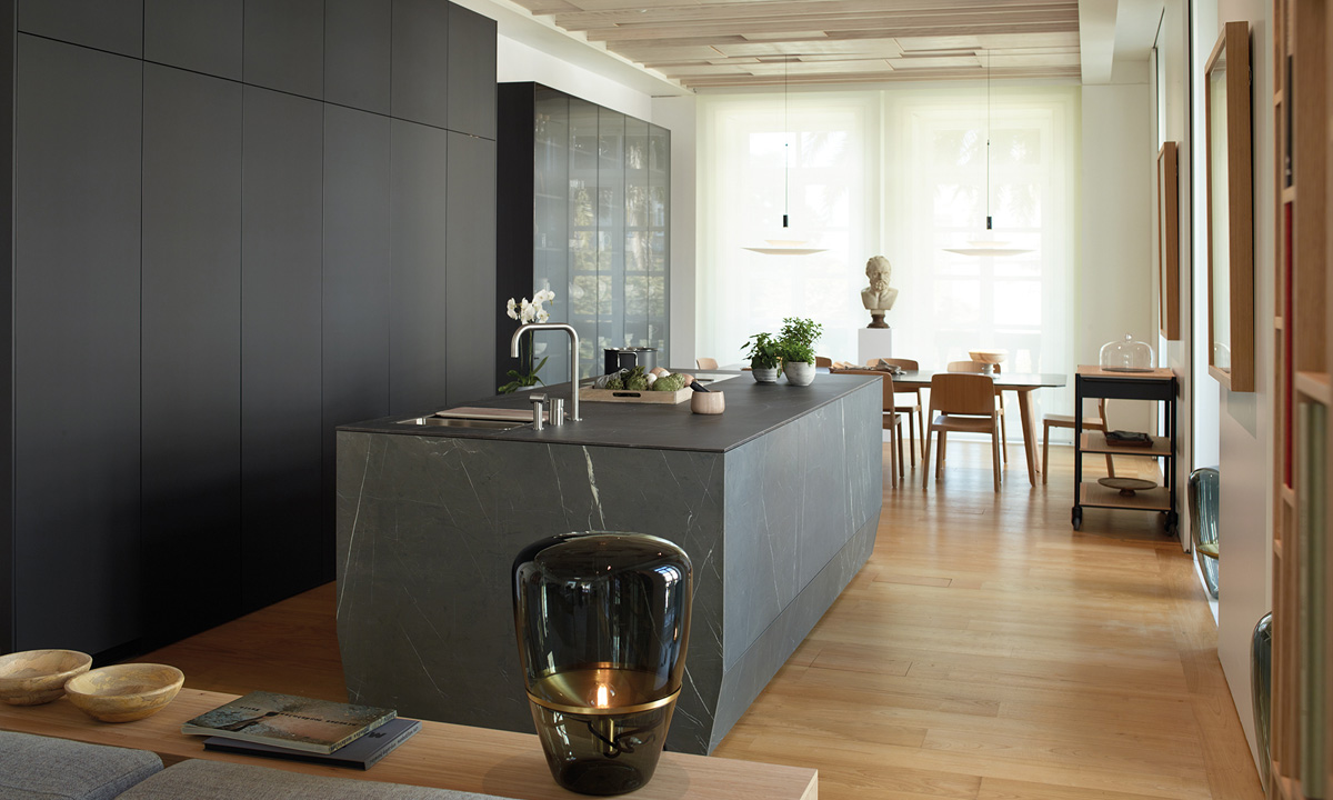 Con las columnas moduladas a techo, Santos integra en un reducido espacio electrodomésticos (horno, frigorífico, microondas...) y diferentes módulos de almacenaje, lo que permite ganar espacio en la cocina.